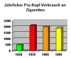 - Die Anzeigenkosten für Zigaretten in Zeitungen und Zeitschriften betrugen 1989 in den alten Bundesländern 89,5 Millionen Euro. Die Ausgaben für Außenwerbung, Kinospots, Direktmarketing, Sponsorship, etc. werden auf 250 bis 360 Millionen Euro geschätzt.